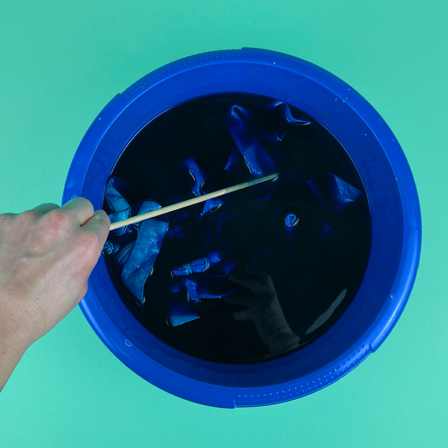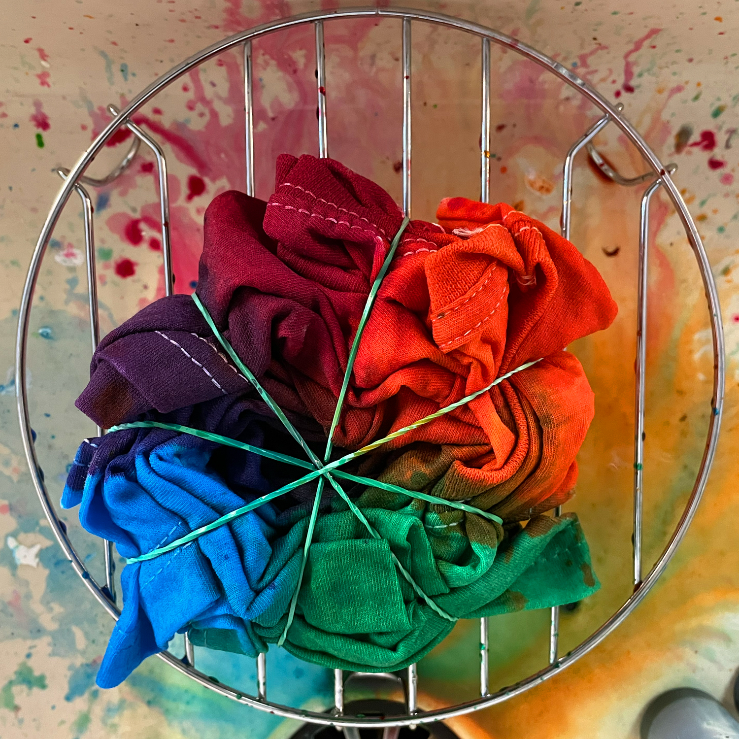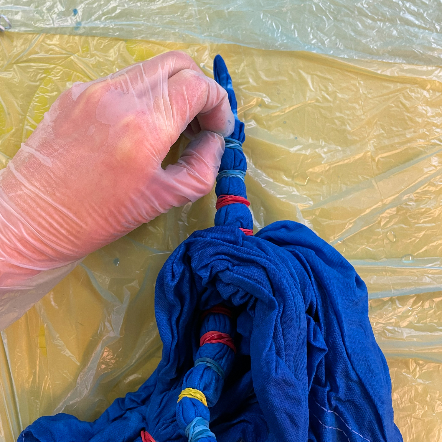 Die Schnüre werden nun vorsichtig aufgeschnitten, sodass das Wäschestück trocknen kann. Tipp: für eine höhere Waschbeständigkeit wird das Wäschestück 15 Minuten in das Fixierbad gelegt.