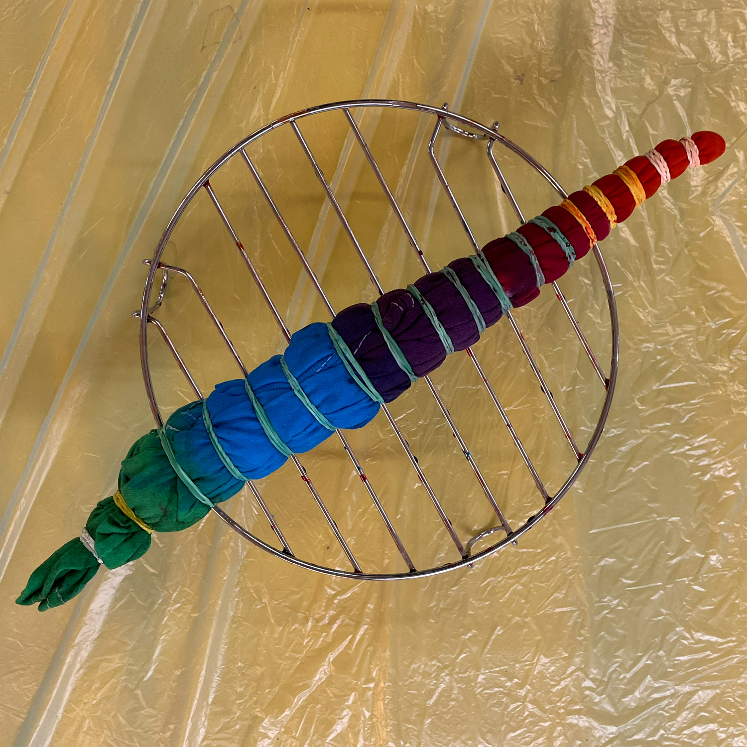 Die Schnüre werden nun vorsichtig aufgeschnitten, sodass das Wäschestück trocknen kann.