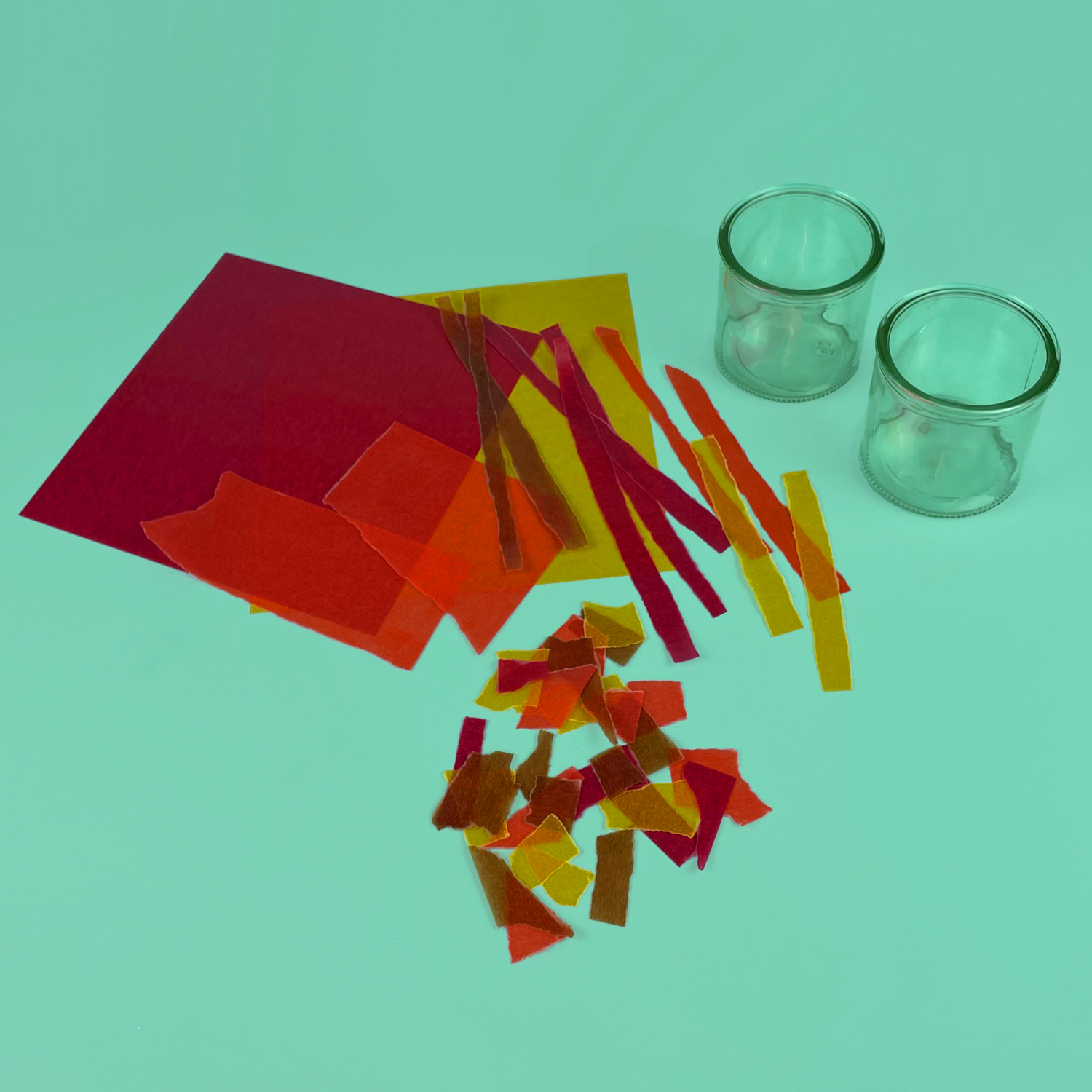 Pergamin in herbstlichen Farben wird ausgewählt und in verschieden grosse Stücke oder Streifen gerissen. Die gewünschten Kerzengläser werden bereitgestellt.