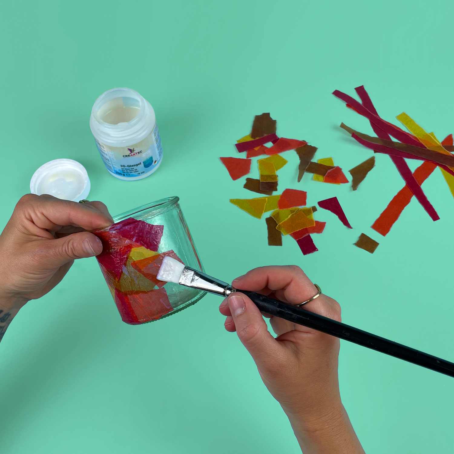 Mit einem flachen Pinsel wird das 3D-Glasgel als Basis auf das Kerzenglas aufgetragen, das Pergamin daraufgelegt und mit dem Gel versiegelt. Die Pergamin-Stücke können wild durcheinander oder geordnet platziert werden. Wenn das Kerzenglas fertig beklebt wurde, muss das Gel für ca. 4 bis 6 Stunden aushärten. Nach dem Trocknen ist das Glasgel wasserfest und hitzebeständig.