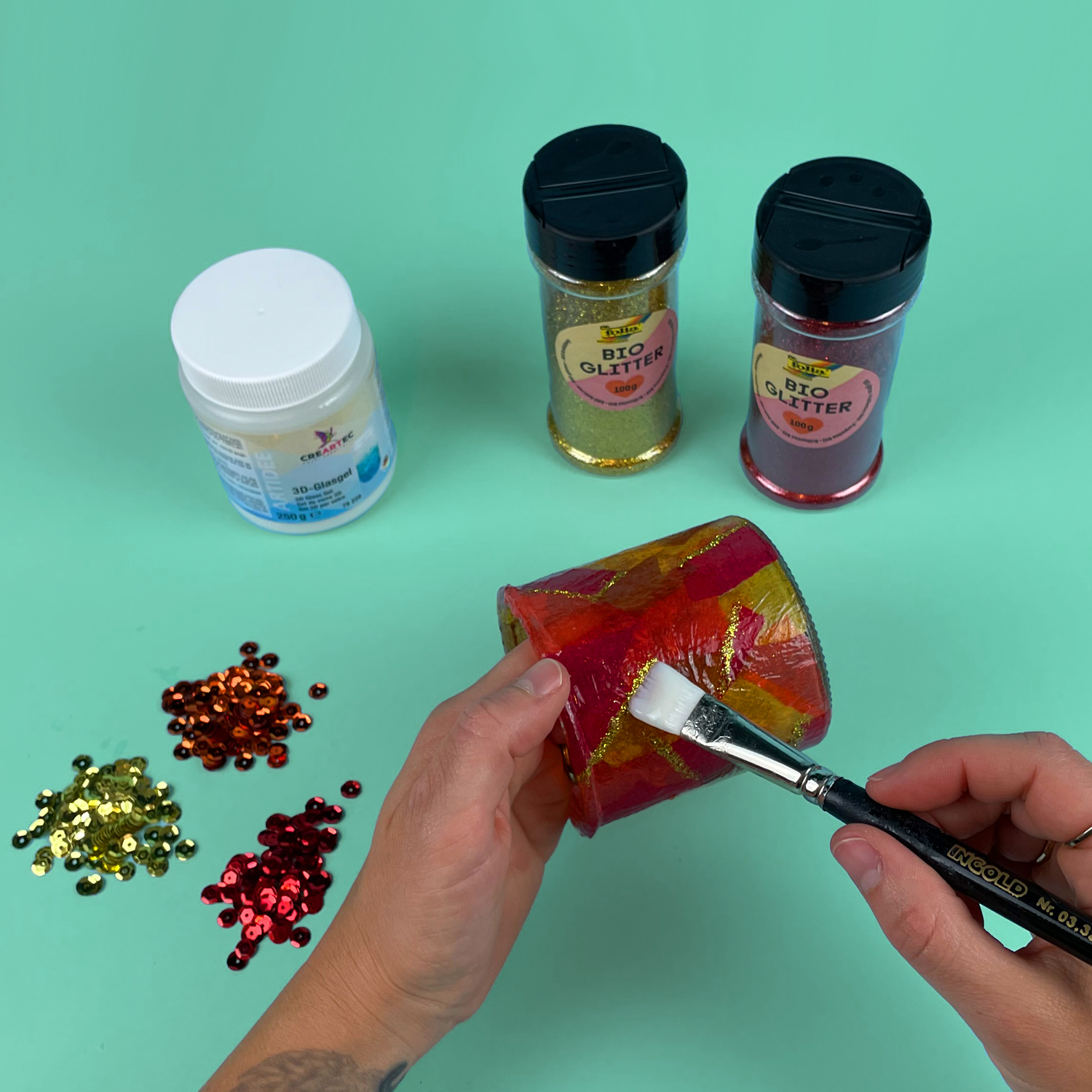 Die Kerzengläser können nun individuell mit Glitter, Pailletten und vielen weiteren leichten Materialien verziert werden.
