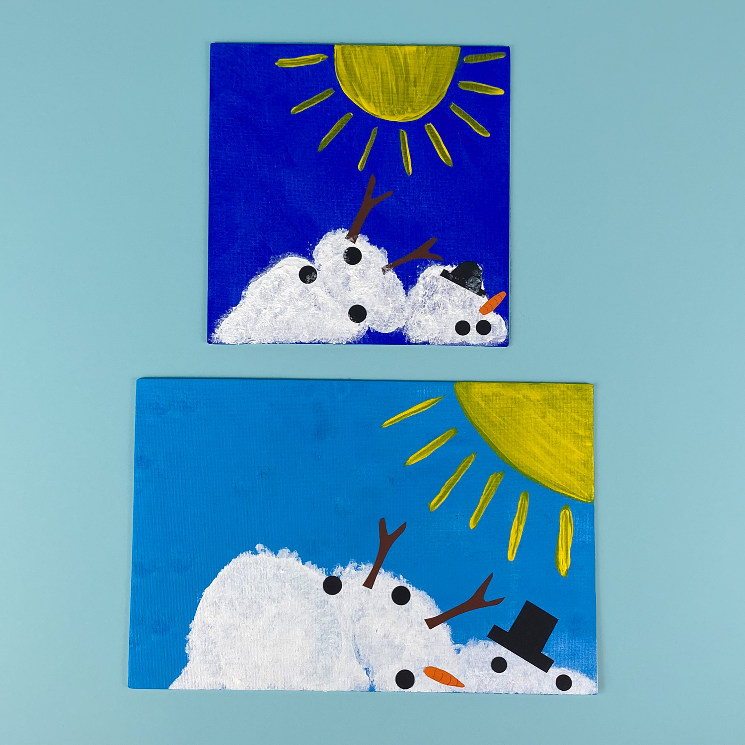 Wie schmilzt ein Schneemann? Mögliche Ideen werden auf einem Blatt Papier skizziert. Ein Zeichenkarton wird grundiert und zum Trocknen beiseitegelegt.