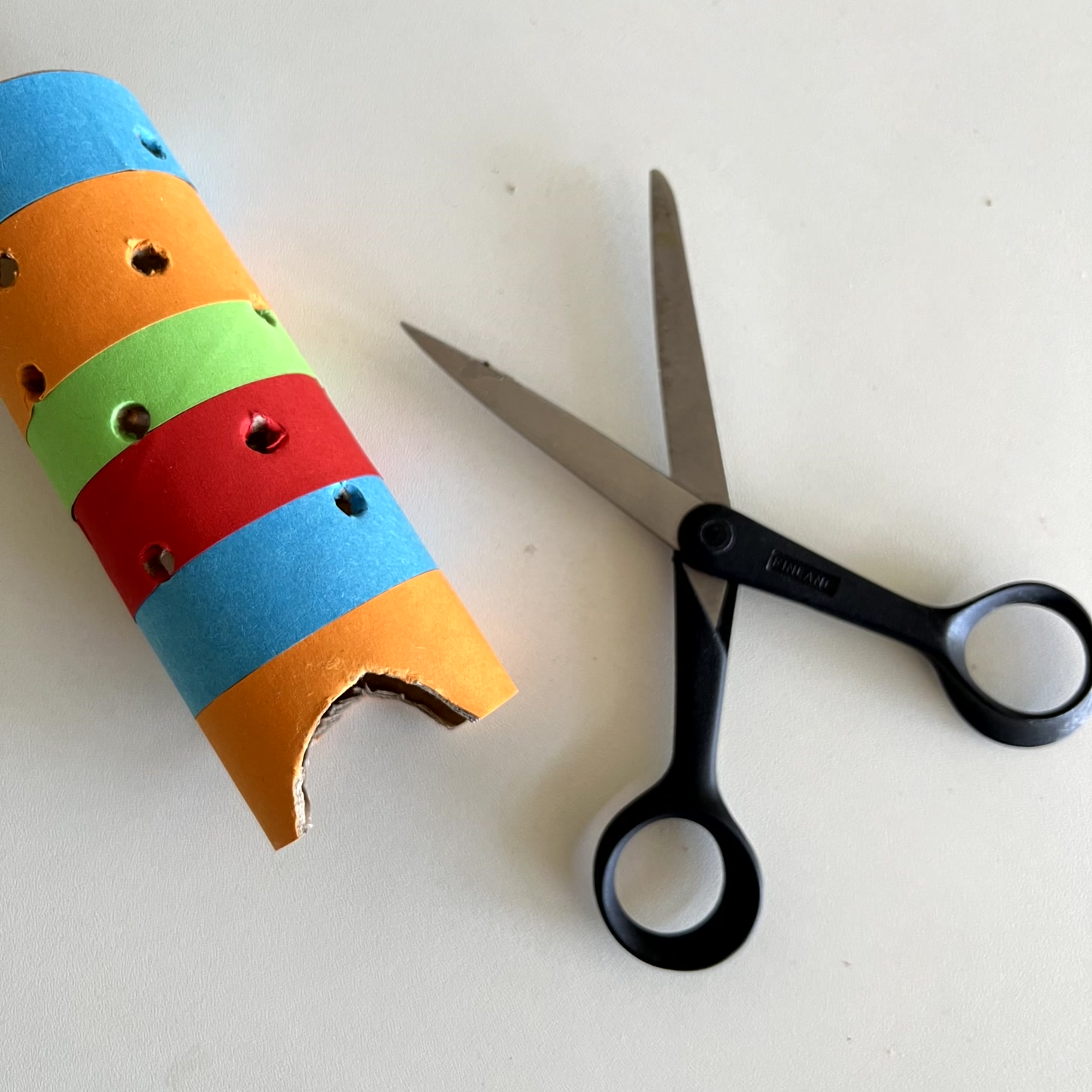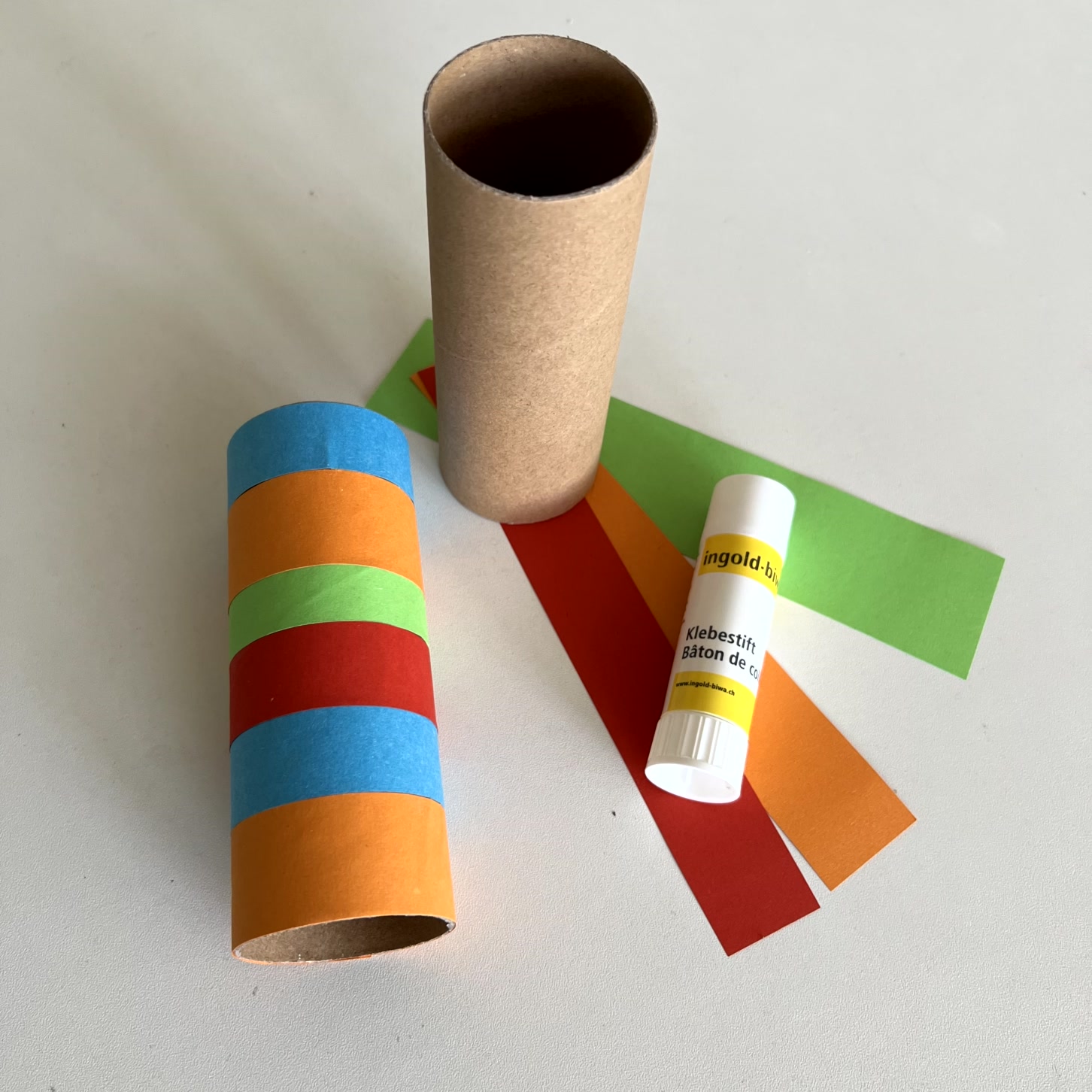 Im ersten Schritt wird die Kartonrolle nach Belieben verziert. Hierfür können beispielsweise bunte Papierstreifen aufgeklebt werden. Alternativ kann die Rolle auch mit Pinsel und Farbe bemalt werden.